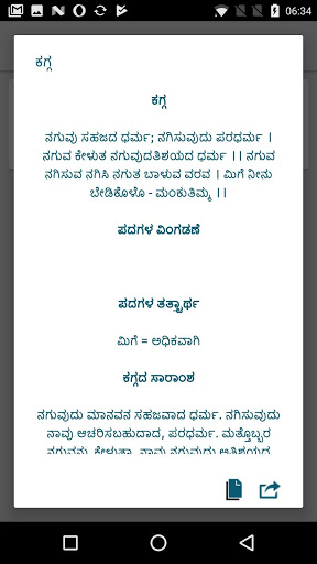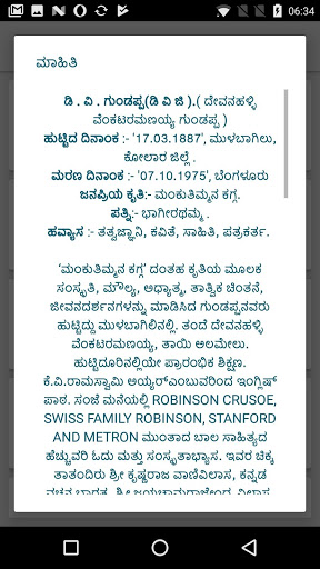 This app consists of around 900 'Mankutimmana' & around 750 'Marulamuniyana' - descriptive-kaggas with difficult words elucidated enough for any layman to understand and make out the philosophy by himself, Also it has a detailed explanation about each and every Kagga.