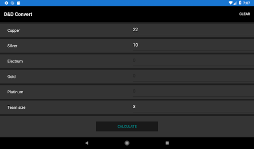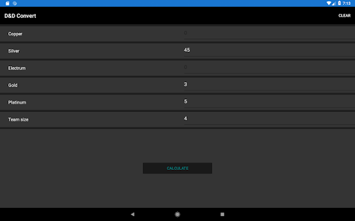 Splitting coins among team members after a fight or other event can be time-consuming and confusing. Even more so if the coins don't distribute evenly among the party. Enter the total currency and the number of party members and this app will take care of it.