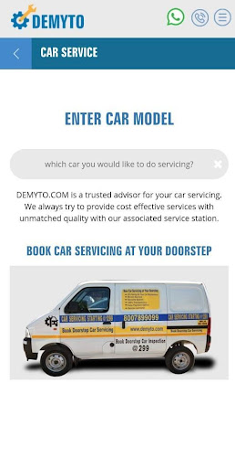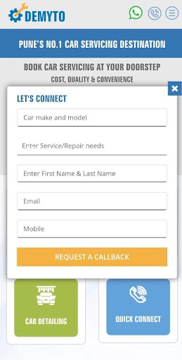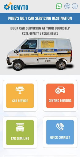 Demyto.com, is Pune's Trusted Car care Service! You have any Car then Demyto.com is a one stop shop solution for your vehicle after sales service. Using this application you can Book your Servicing, Repair, Denting & Painting at fixed price at any authorized Demyto.com dealer. Demyto.com goes way beyond the boundaries to deliver all possible auto services with free pickup & drop. We combined innovation and user friendly approach to locate nearest vehicle dealers anywhere in Pune, Thane & entire Navi Mumbai region. Our mission is to provide complete and state of the art after sales service for your Car through our registered dealers. Call us at 918007899099 for instant assistance. We serve any Car models like Audi, BMW, Tata, Maruti Suzuki, Hyundai, Chverolet & Toyota. All our mechanics are expert in dealing with Car Servicing, repairs & any car denting painting work. We successfully served more than 5000 customers with our Car services.
