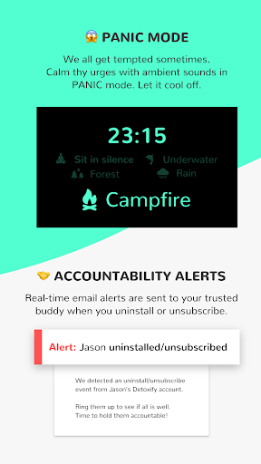 Uninstall and unsubscribe alerts to a trusted buddy you nominate. Be held accountable for your actions.
