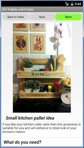 Over three dozens diy pallets and crates ideas are available in this app – storage space idea, worktable for your garage, comfortable sofa with cushions and many more. If you need storage space, then you will love diy crate ideas included in this app.