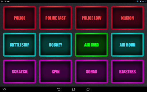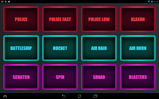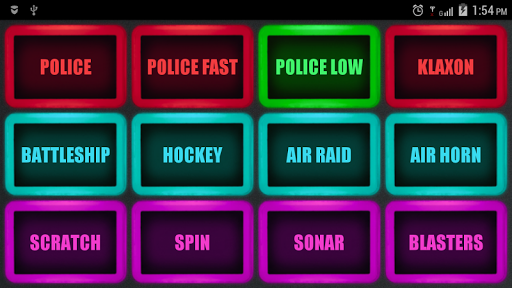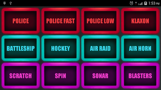 There are 12 high-quality lossless sounds (different types of siren: police, alarm, navy, air raid, klaxon, blaster, vinyl scratch, spin, air horn). You can load your own sounds with a single click of a button. Supportable files: wav, flac, mp3, ogg. (Note the duration of audio file is limited to 6-20 seconds and depends on recording format). The button's title will change according to filename. The interface is simple and readable, no useless elements.