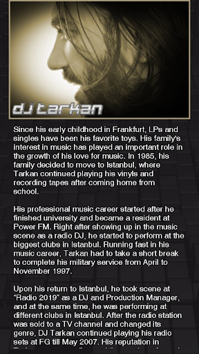 By downloading this application; you can listen all his albums and watch all videos of famous DJ Tarkan who is known all over the world. You can follow his Twitter feed, contact with him at any time you want, surf in his photo gallery and get information about most updated events and news about DJ Tarkan.