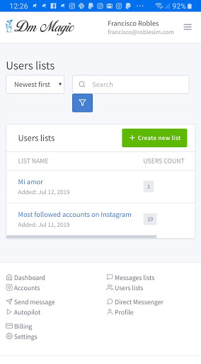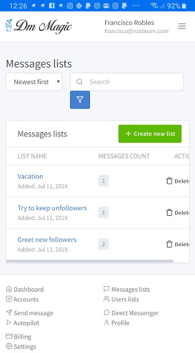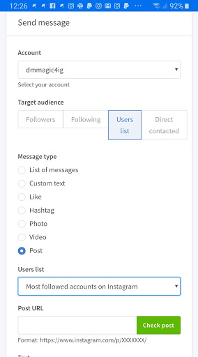 Greet with warm welcome message your new followers by sending customized text message. Create your own list of users and send them text message with emoji, post, hashtag, video or photo.