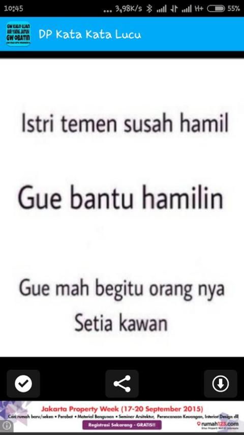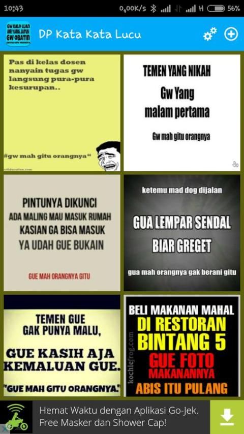 Gambar DP Kata Lucu merupakan kumpulan gambar lucu yang sangat menghibur, didalam aplikasi ini terdapat banyak sekali kumpulan gambar gambar lucu terutama yang menyangkut gw mah gitu orangnya. Gambar gambar tersebut dapat anda jadikan sebagai DP, Simpan, Bagikan, Atau anda jadikan sebagai wallpaper.