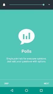 - POLLS: Single point tab for everyone opinions. Just add your questions with options.