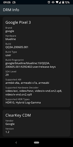 This app will display the information of the Digital Right Management (DRM) module from Android Media Framework and MediaDrm API.
