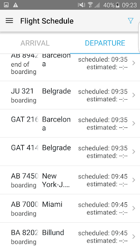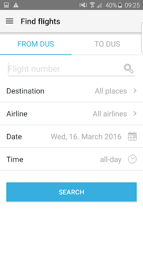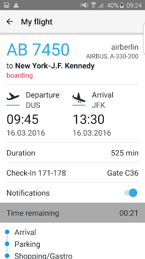 • My Flight: Save your flight data, follow your flight routes on a timeline and activate the push notification service to get information on changes of departure time or gate