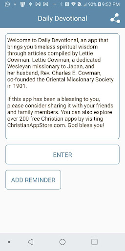 Welcome to "Daily Devotional," an app that brings you timeless spiritual wisdom through articles compiled by Lettie Cowman. Lettie Cowman, a dedicated Wesleyan missionary to Japan, and her husband, Rev. Charles E. Cowman, co-founded the Oriental Missionary Society in 1901. This society was established with a noble mission: to plant churches and spread the message of faith across the globe, excluding North America.