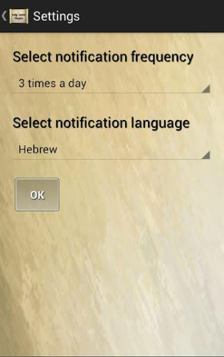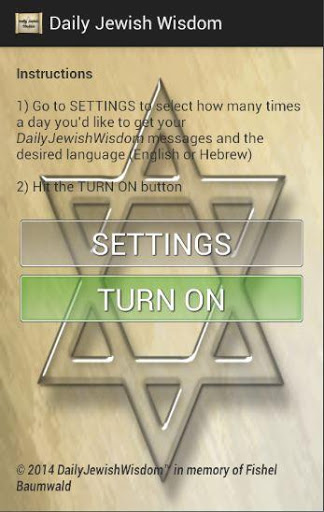 Daily Jewish Wisdom has a pretty simple and straightforward user interface. After launching the app, the main screen will guide you through the simple setup process. The Settings button will launch the settings screen where you can choose your desired notification frequency and the desired language (Hebrew or English). Clicking on the Turn On button activates the app. The app will run in the background and send its notifications at the desired frequency. To stop the app, launch it again and click the Turn Off button.