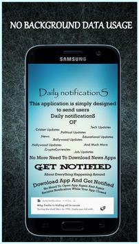 The app "Daily Notifications" mainly targets on top trending News regarding Cricket, Football, Bollywood, Hollywood etc. It also provides you with the earning related updates likes Jobs, Cryptocurrencies and Tech related updates.