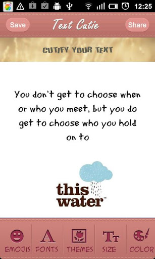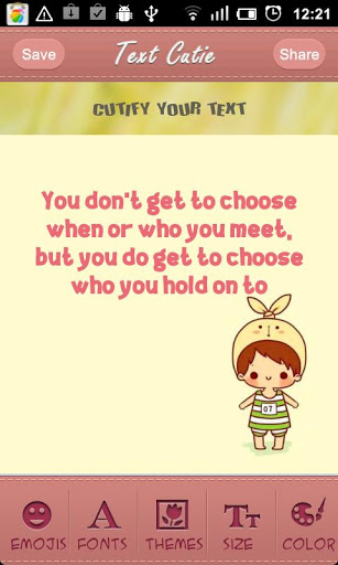 Totally free with 10000 Selected Sayings and Quotes Makeshare sayings and quotes pictures easily Best pluginapp for TextCutieThis is a small app that let you share quotes or make quote pictures easily . You can get 10000 quotes by switch to quot;All sayingsquot;, or read daily selected saying.You can share the quotes you like to twitter facebook instagram, by pic stitch, pic collage , jusgramm, text cutie text cute etc.Just enjoy it.Notice:1. If you do not like the ads, you can close them by click quot;xquot; in the bar or in the options bar.2. If you have any suggestions, contact me : Mikolee520@gmail com. Warm welcomed