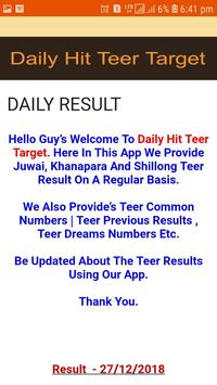 Hello Guy’s Welcome To Daily Hit Teer Target. Here In This App We Provide Juwai, Khanapara And Shillong Teer Result On A Regular Basis. We Also Provide’s Teer Common Numbers | Teer Previous Results, Teer Dreams Numbers Etc. Be Updated About The Teer Results Using Our App.