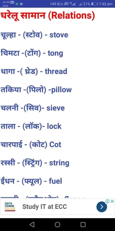 Household ,food ingredient , relation, ornaments ,flowers important word with meaning