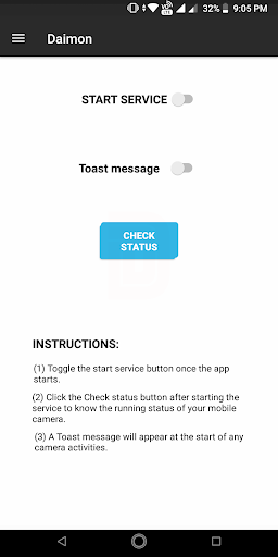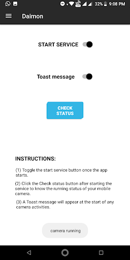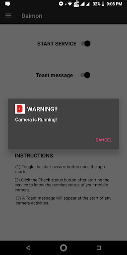 Attackers can embed malwares in harmless application apks.This app alerts the user when a payload or any other unwanted application tries to access the camera without users knowledge on the background where the users will never know the camera is running this app allows you to know the running status of
