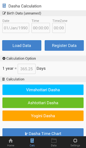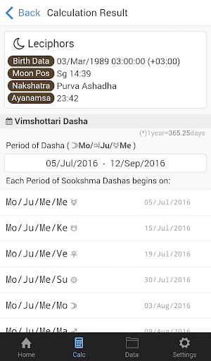 - calculates the each Dasha period using the input data (birth date, birth time, time zone) .