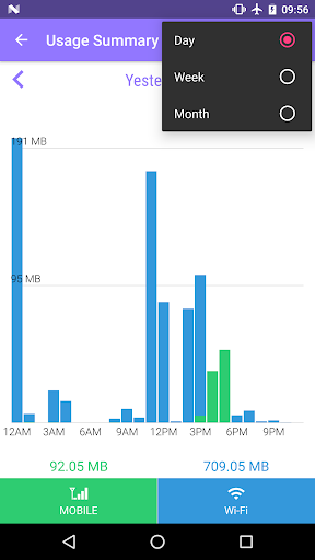 - Browse data traffic bar chart in connection type, app usage and date range.
