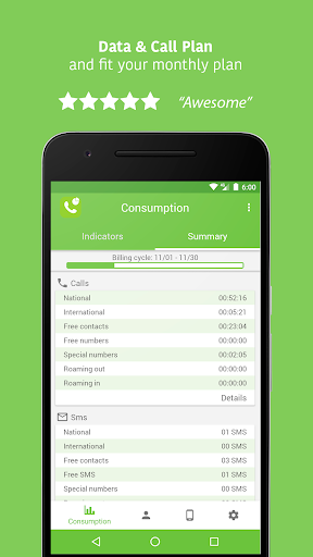 Data & Call Plan is the easy to use app giving you powerful real time details about your data and call consumption of your Cell Phone. Data & Call Plan helps you to fit on your monthly plan not surpassing the limits, and letting you to take the most from the money paid to the mobile company.
