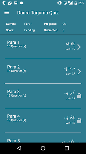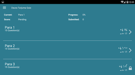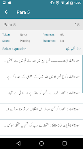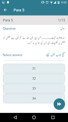 There are a total of 25 quizes which cover all 30 Paras of the Holy Quran.