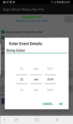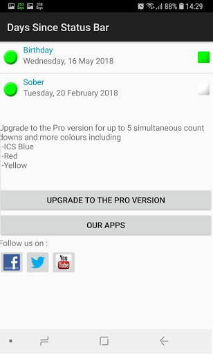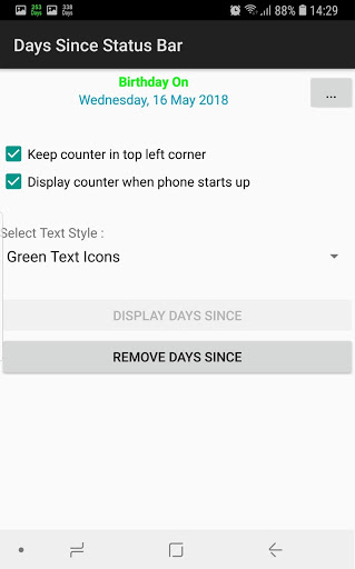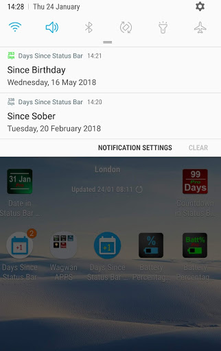 Count the days since your special event using "Days Since". The Days Since are shown in the status bar and and are always visible even when your phone is locked unlike widgets and can run up to 2 simultaneous events in your status bar.