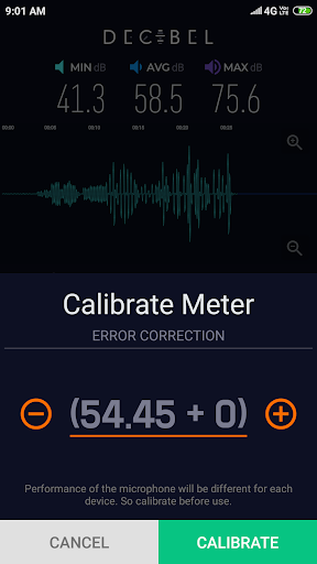 The value of sound meter is not as precise as an actual Sound Pressure Level Meter (SPL meter) sound meter, this is due to most device's microphone are aligned to the human voice. To fix this, use an actual sound meter or Sound Pressure Level meter (SPL meter) to adjust decibels error as close as possible before use. If you didn't own an actual Sound Pressure Level meter (SPL meter), go to a very quiet place where sound cannot hear and adjust the reading value to 20~30dB.