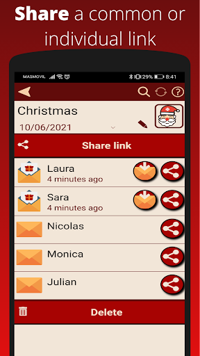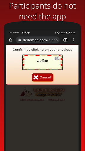 Introduce a list of names and let Dedoman relate them randomly. You can assign groups to candidates so people who belongs to the same group or "team" won't be assigned. This is useful when for example you are a group with several families and you don't want members of the same family buying between themselves.