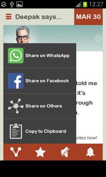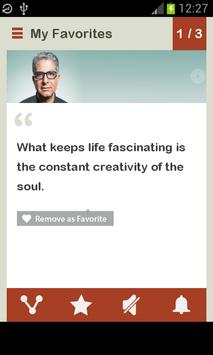 Deepak Chopra Daily presents the wisdom of New Age Spiritual Guru to your Android Phone. Now wake up daily with the best of Deepak Chopra & not only you can inspire yourself, also share these pearls with your friends & loved ones to create a deep impression on their life. Download now. It's free & does not require Internet Connection. You will love it!