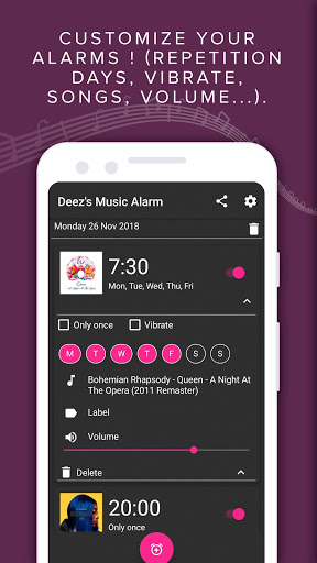 - Play your alarm every Monday, Thursday, Friday or other days. Forget about setting alarm again and again. Wakeup to new songs everyday powered by Deezer Music. Set specific songs for specific days. Sometimes having cool alarm clock sounds can set a positive tone for the whole day. The nice & customized repeat alarm clock can change the way you wakeup!