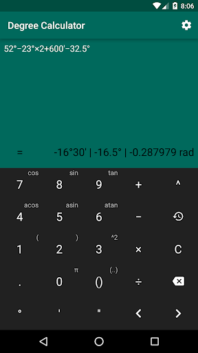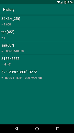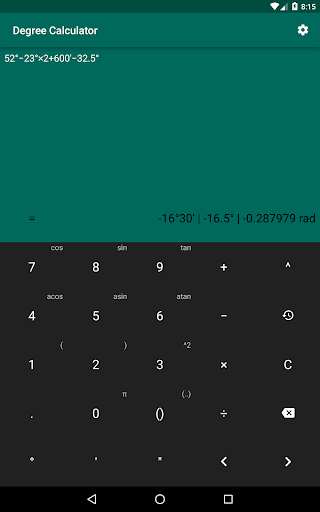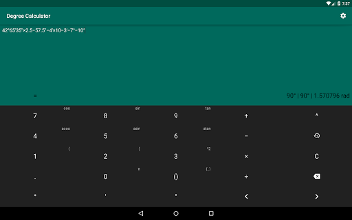 This app allows you to easily perform algebraic and trigonometric operations with degrees, minutes, seconds, radians and numbers. It has next features: history of calculations, haptic feedback, screen sleep prevention.