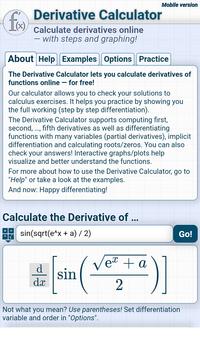 When the "Go!" button is clicked, the Derivative Calculator sends the mathematical function and the settings (differentiation variable and order) to the server, where it is analyzed again. This time, the function gets transformed into a form that can be understood by the computer algebra system Maxima.