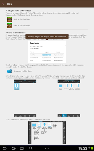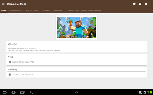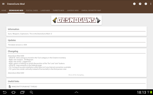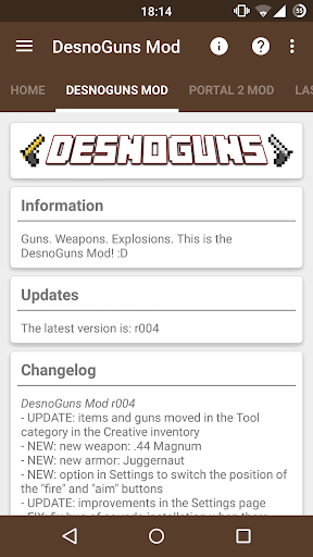 The mods for MCPE available in this app are: DesnoGuns Mod, Portal 2 Mod, Laser Mod, Turrets Mod and Jukebox Mod.