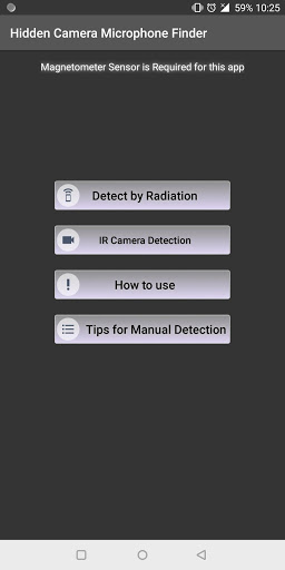 Spy cameras scanner are so common these days that they are hidden in clocks, watches, teddy bears, remotes and key chains. The Detect Hidden Cameras and Microphones uses magnetometer sensor present in android phone. All the Camera and Microphones have their magnetic field. These cameras and microphones can be detected by even when they are turned off scanner.