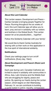 This app is a Lent Calendar that uses the learn, pray and act approach to take users on a global solidarity journey where each day they learn about peacebuilding initiatives via a short text, video or photo.