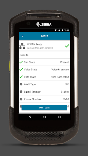 • WWAN Tests: checks for operation of the WWAN radio and returns related WWAN information: SIM state, voice state, data state, WAN type, signal strength, phone number, and device ID.