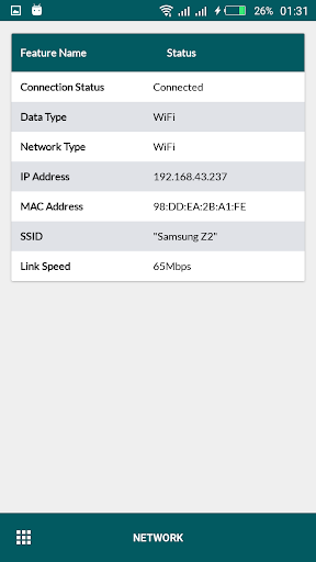 - Network: Shows WLAN and WAN connectivity, Periodically collects network information (addresses, SNR) and displays it on screen, WiFi feature list