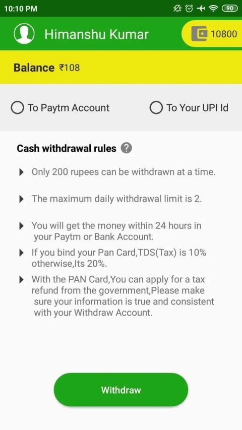 You can withdraw your Income when the Balance is at least Rs 200
