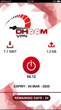 Dhoom VPN is a lightning-fast app which provides free VPN proxy service. Not need any configuration, just simply click one button, you can access the Internet securely and anonymously.