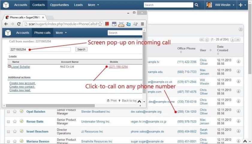 Click-to-call, screen pop-up on incoming call and calls history for SugarCRM users.