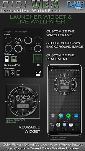 This completely customizable interactive HD Wear OS Watch Face, Clock Widget & Live Wallpaper brings a classic elegance to your wrist and Launcher. Features include custom complications, battery levels, weather conditions, step counter, color picker & date information. A settings app will also be installed on your mobile device to configure the watch face for any look you desire. Select any color and create a completely custom look for yourself! Don't have an Android Wear watch? No Problem! You can use the clock widget or Live Wallpaper on your launcher!