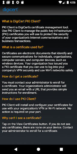 PKI Client will install and configure your certificates for use with your organization's VPN or Wi-Fi network. No action is required on your part.