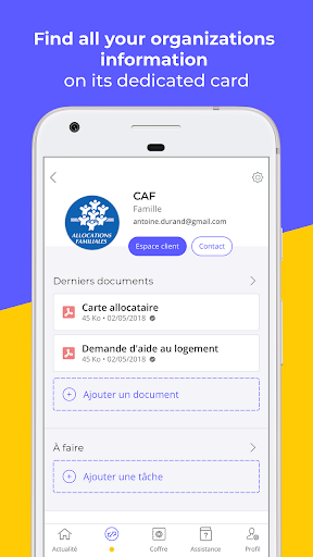 Your organizations are automatically classified by universe. Within an organization sheet, in addition to consulting your documents, you may also now add tasks with reminders, and store useful information in a sheet provided for that purpose.