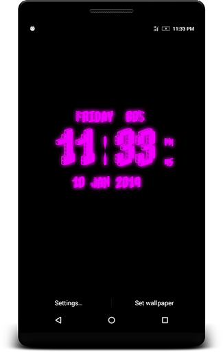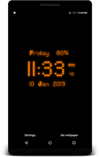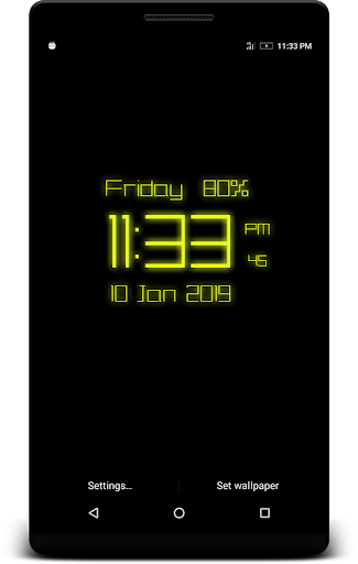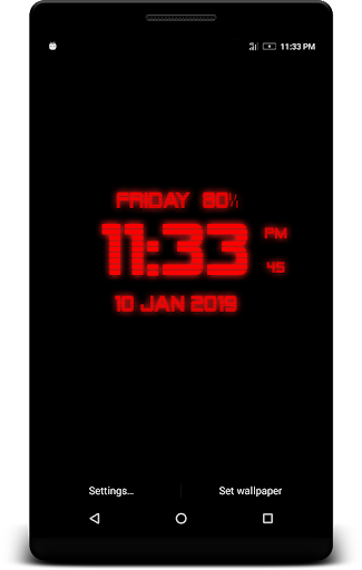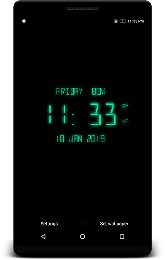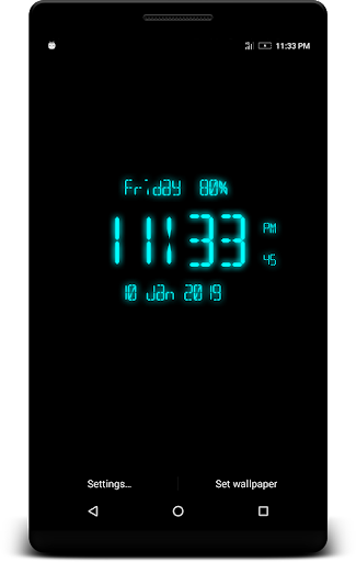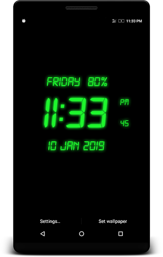 Live Wallpaper that displays current time, date and day of the week. All date and time formats are supported.
