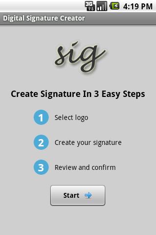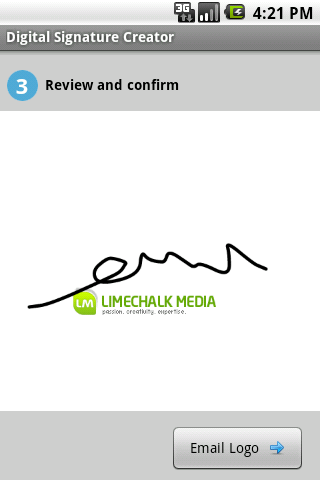 Create digital signature in few easy steps using your Android phone and have it sent to your email Feature includes:- Choose to upload company logo or not.- Choose signature color- Choose signature stroke widthhttp://digitalsignature.limechalk.net/Recent changes:- remove admob as it might have been causing problem on motorola cliq.- Supported OS version 1.5+. Previously only 2.1-update1 above is supportedcontent rating: Everyone