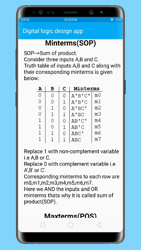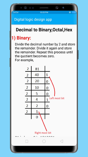 This app is very useful for those who are learning digital logic design in computer science or engineering. The interface is designed in a very simple and professional way for the ease of users. The app contains both notes and converters like decimal to binary converter, decimal to hexa converter, binary to decimal converter etc. The app contains digital logic design notes which include following topics: