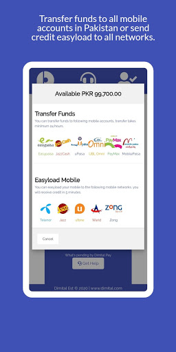Dimital Pay - a solution to transfer funds to your local mobile accounts like Easypaisa, JazzCash, uPaisa, PayMax, MobilePaisa and send Mobile Credit easyload to all Mobile Networks like Jazz, uFone, Telenor, Warid and Zong.