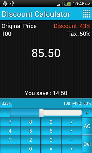 Drag the seekbar or press the ‘ ’ ‘ and ‘-’ button to set the discount value quickly,check the ‘Include Tax:’ to calculate a product contain tax after discount.