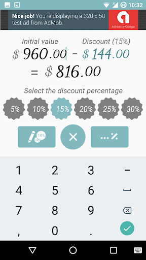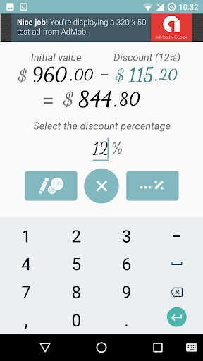 Calculating discounts has never been so simple: enter the amount, tap the button with the desired percentage, and you're done! The calculation will be performed and displayed automatically!