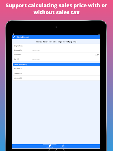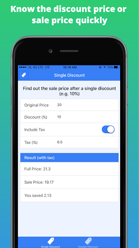 "Sale Discount Calculator - Percent Off & Sales Tax" is an app that allows you to find the reduced price of a product and the amount of money you save. As a shopper, you can also use "Sale Discount Calculator - Percent Off & Sales Tax" app as a sale price calculator to help you negotiate the price. Depending on your needs, our "Sale Discount Calculator - Percent Off & Sales Tax" app goes well with double discount calculator. "Sale Discount Calculator - Percent Off & Sales Tax" app is the ideal shopping companion.