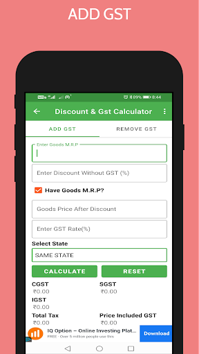 First you have to choose GST tax Rate and then you have to enter M.R.P and Discount value and app will calculate amount or price after discount. Which amount will appear app will show the value without GST means it will remove GST from value. then you can further Tax value on that price.