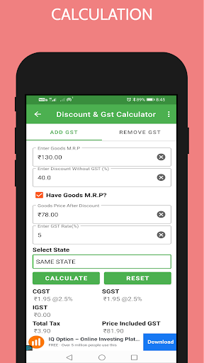 For exp: if there is price after discount is 400 and Tax Rate is 5% then price without GST is 380.95 and then you have to click on calculate and app will calculate CGST,SGCT,IGST and Total Tax and Price included GST.